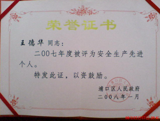 中昇建机王德华组长荣获2007年度安全生产先进个人