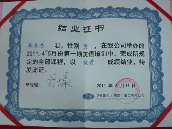 图7 李冬冬同志以优异的成绩荣获英语结业证书——是各位同志学习的楷模