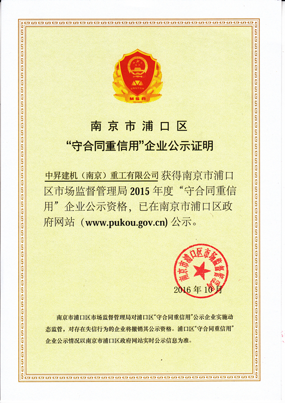 2016年10月,我公司获得南京市浦口区市场监督管理局2015年度“守合同重信用”企业公示资格,已在南京市浦口区政府网站(www.pukou.gov.cn)公示。 2016-10-01 |