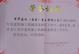 中昇建机被评为2011~2012年度江苏省建筑施工机械设备租赁“十佳单位”
