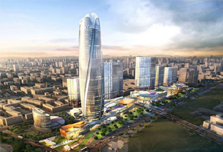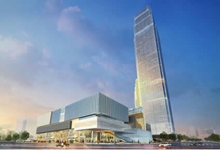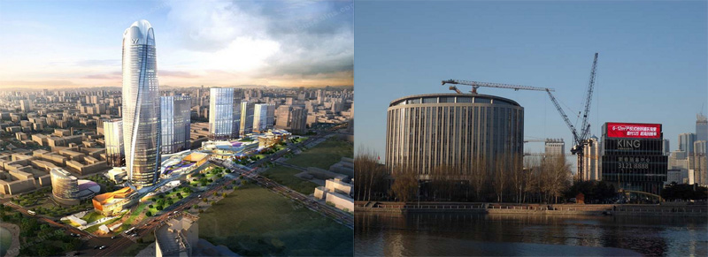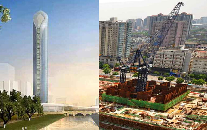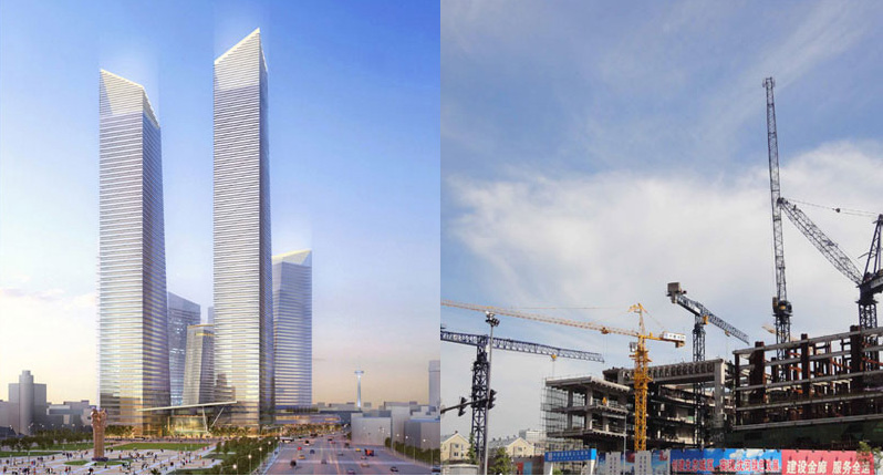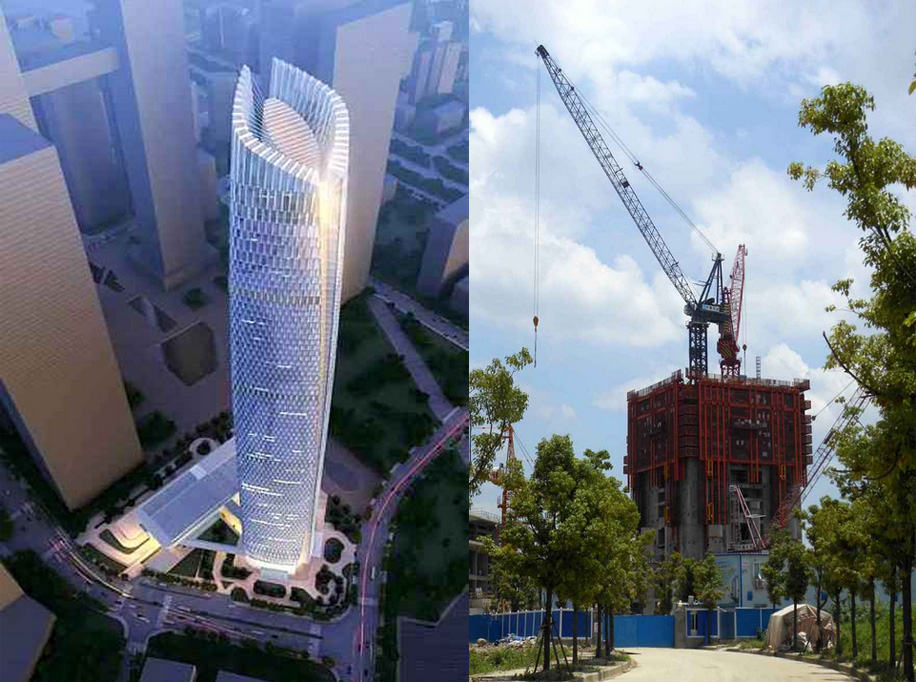 建筑主体高度438米,采用中昇建机ZSL1250(64T)及ZSL380(32T)各一台。