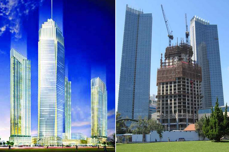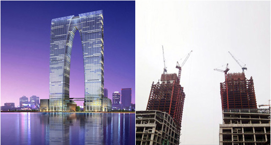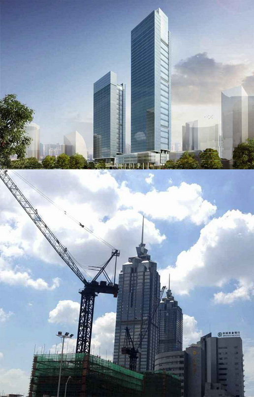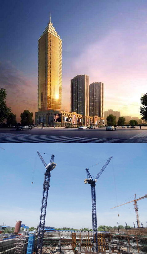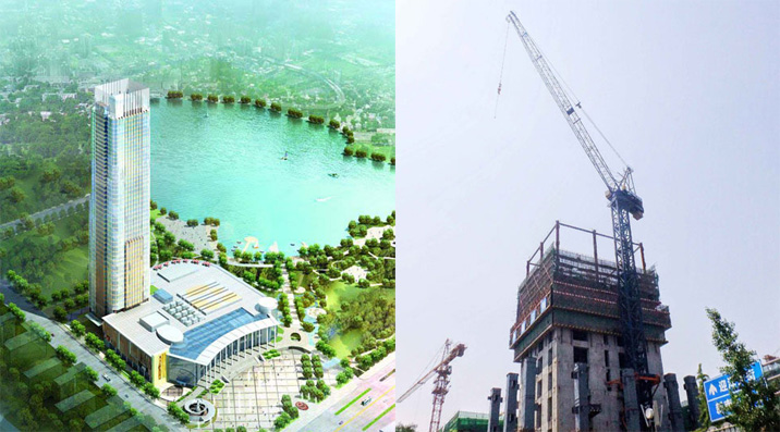 建筑高度380米,采用中昇建机ZSL1250(64T)两台,ZSL750(50T)一台。