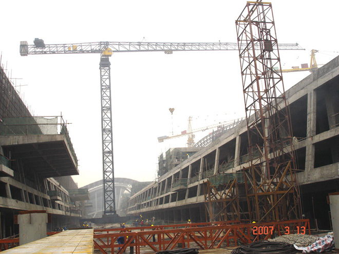 建筑面积45.8万㎡,采用中昇建机行走式塔机ZSC1100(50T)两台、ZSL1100(45T)五台、ZSC300(16T)两台。